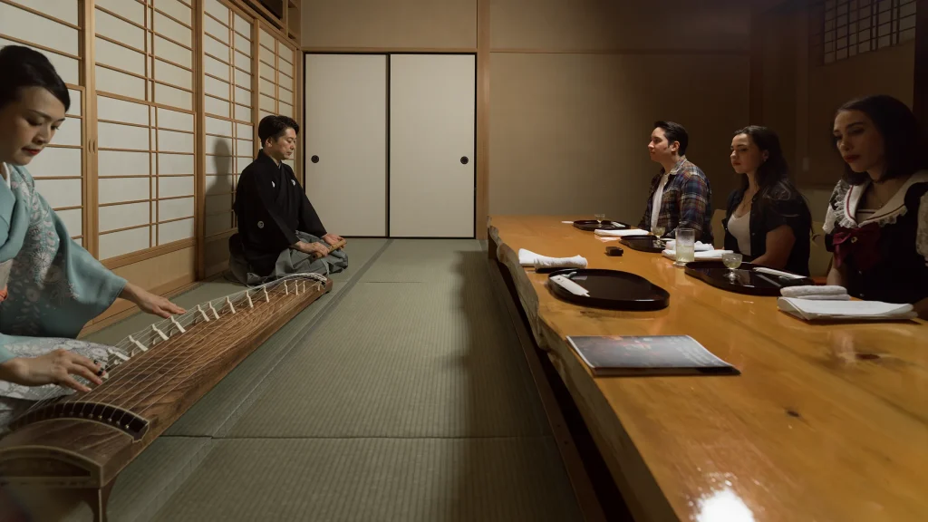 As we settled in and exchanged small talk, the entertainment began to prepare behind the scenes. The evening opened with an exquisite series of appetizers, soon accompanied by live performances of traditional Japanese music by geishas and skilled musicians. The enchanting sounds of the koto and bamboo flute filled the air, creating a serene and immersive atmosphere.
