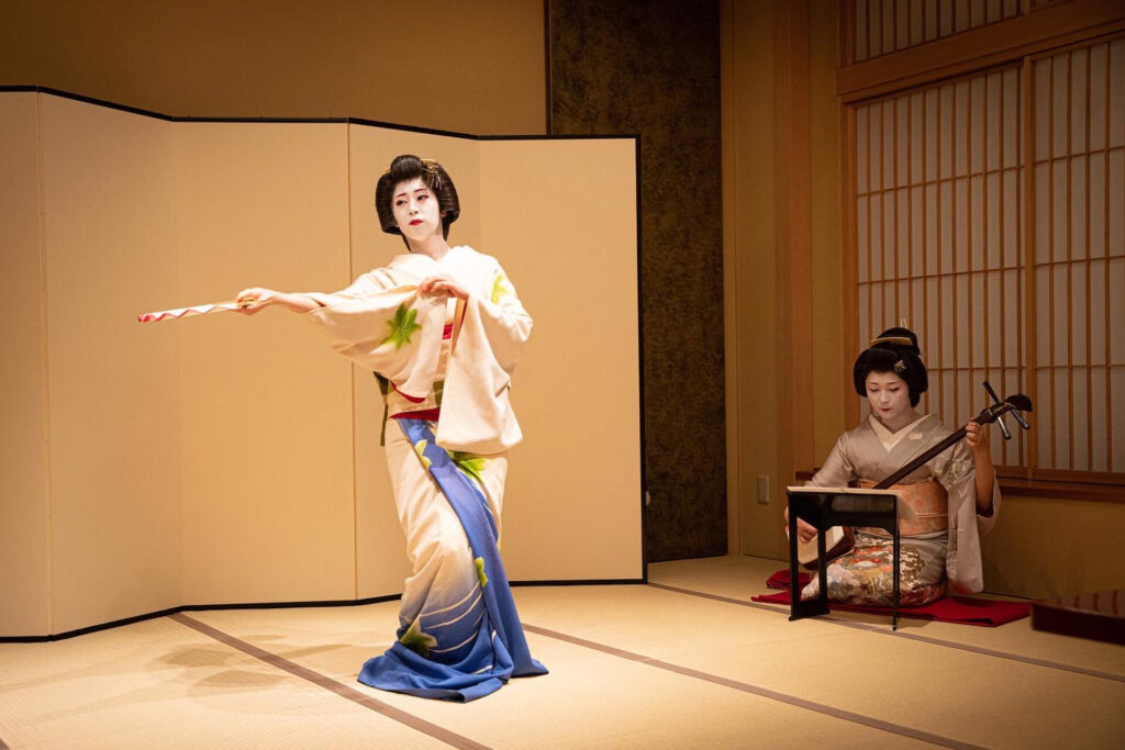 Enjoy the exquisite dances of the Geisha (Geiko), honed through years of daily training, accompanied by the music of shamisen and song.